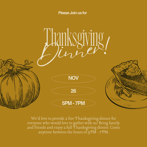 Happy Thanksgiving! Let's share a meal together! We will start serving at 5:00PM - come anytime after. Invite friends, family, and neighbors to join you! The meal is free! We want to provide everyone with a Thanksgiving dinner!