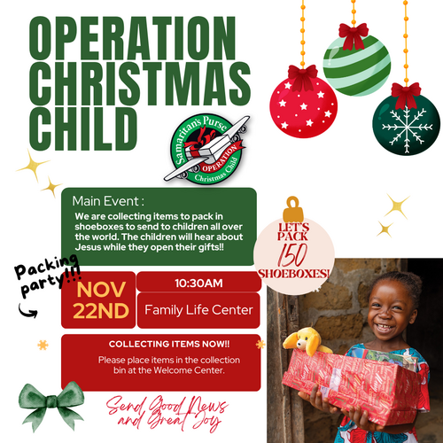 We have been collecting items, and now it's time to pack the shoeboxes! Bring the whole family for an amazing time packing shoeboxes, praying over them, and sending them to countries all over the world to children who will get to hear about Jesus!